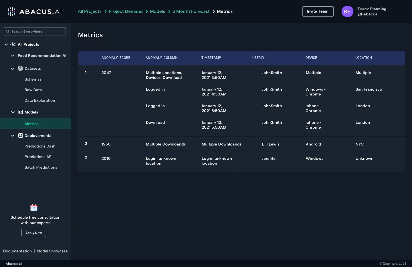 With Abacus.AI you can set up state-of-the-art deep learning models for event-based anomaly detection within hours. These models adjust in real time and spot both simple single events and complex sequence of events anomalies. Our models also help you find the root cause of the anomalies. No cumbersome data preparation or engineering effort to deploy the models in production is required.