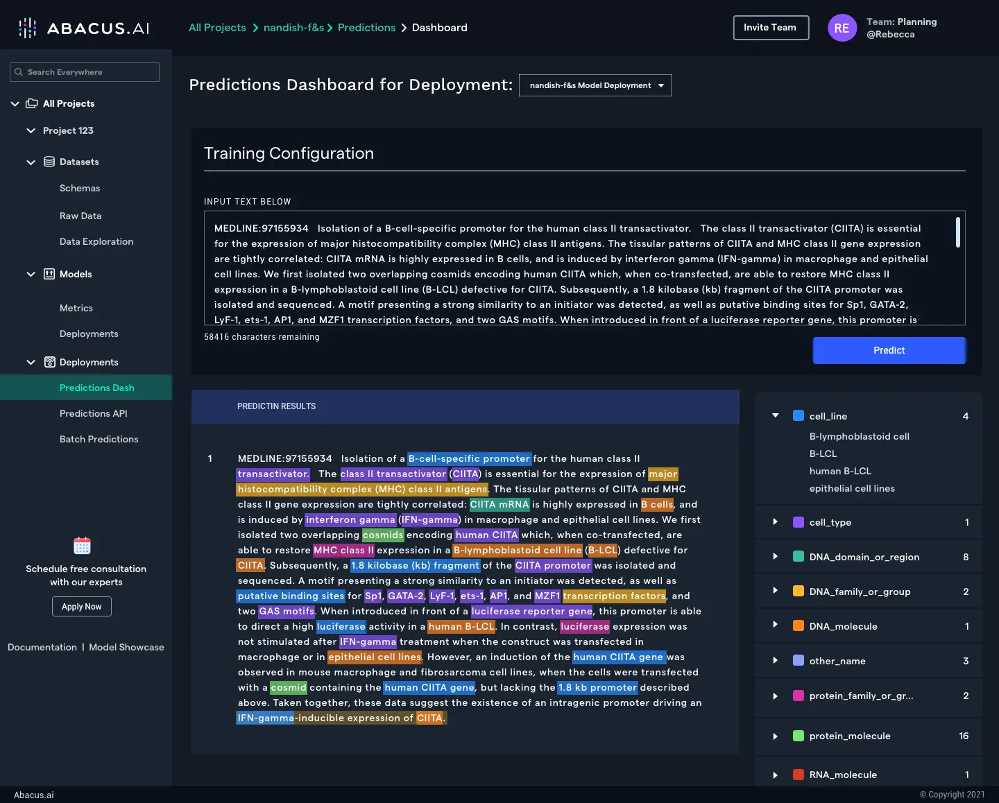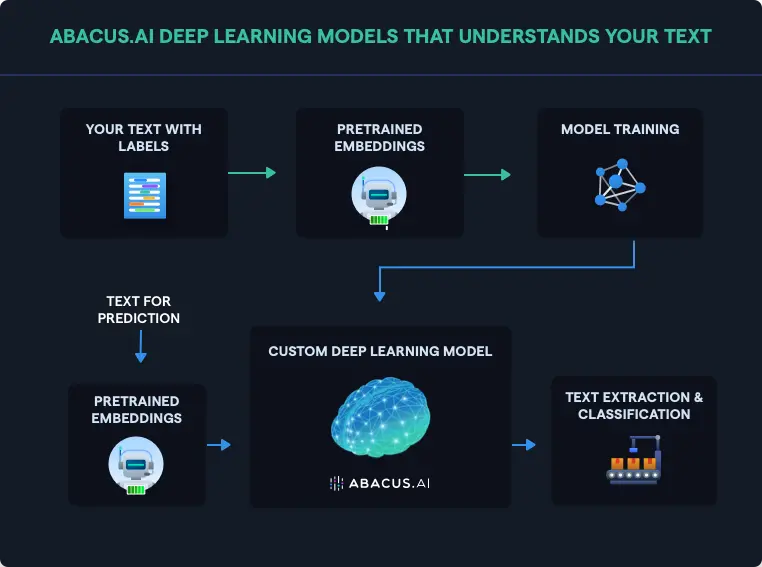 With Abacus.AI you can set up state-of-the-art deep learning models for text extraction and classification within hours. Based on your specific domain and use case, Abacus.AI can fine-tune pretrained models, apply transfer learning or simply train new language models from scratch. No cumbersome data preparation or engineering effort to deploy the models in production is required.