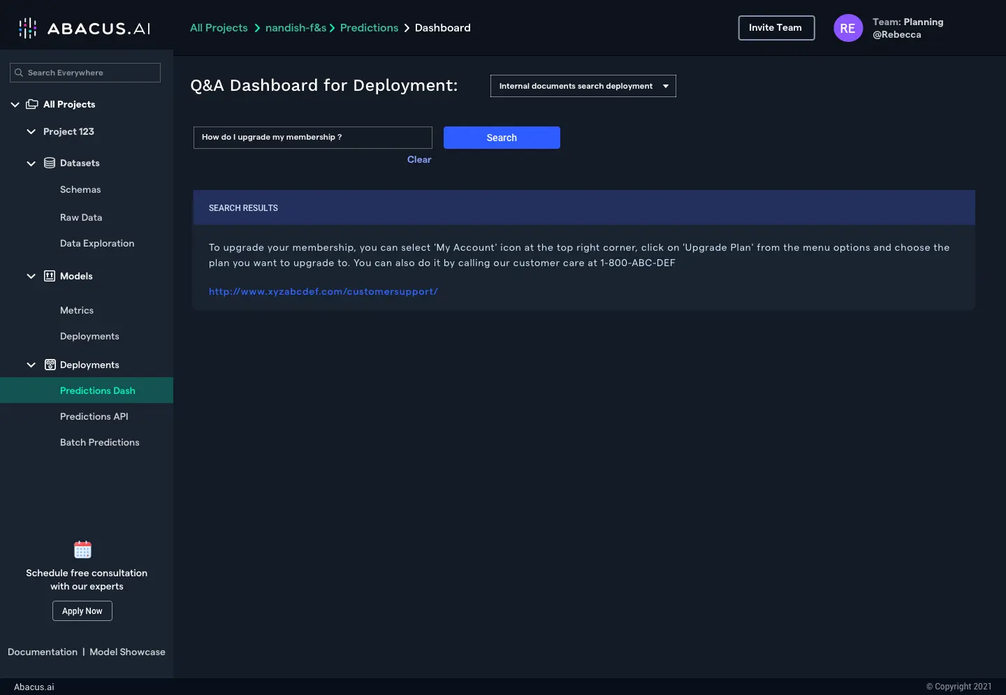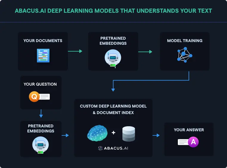 With Abacus.AI you can set up state-of-the-art deep learning models to answer questions within hours. Based on your specific domain and use case, Abacus.AI can fine-tune pretrained models, apply transfer learning or simply train new language models from scratch. No cumbersome data preparation or engineering effort to deploy the models in production is required.