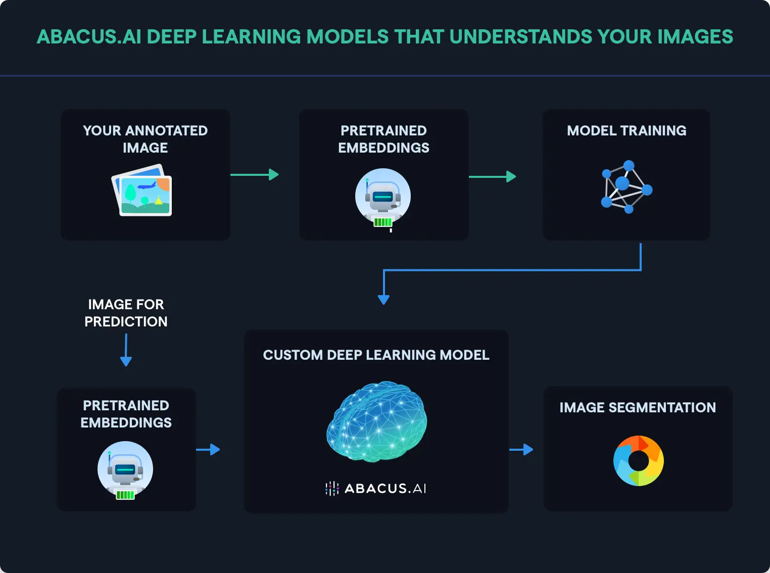 With Abacus.AI you can set up state-of-the-art deep learning models for image segmentation within hours. Based on your specific domain and use case, Abacus.AI can fine-tune pretrained models, apply transfer learning or simply train new vision models from scratch. No cumbersome data preparation or engineering effort to deploy the models in production is required.